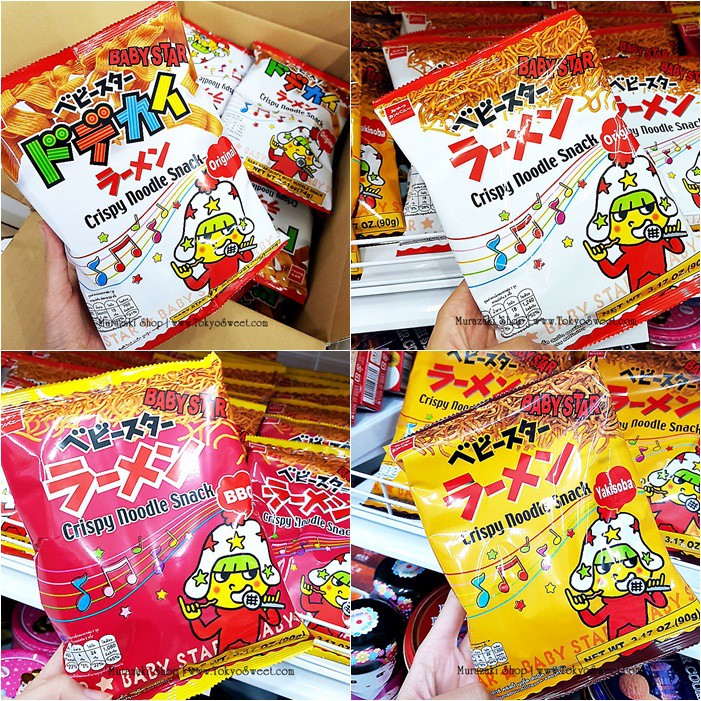 มี 4 รสให้เลือก (สินค้า Made in Japan แต่บรรจุในไทย แพ็คเกจเป็นภาษาไทย) พร้อมส่ง Baby Star Original มาม่ากรอบแบบเส้นใหญ่ รสออริจินัล บรรจุ 74 กรัม พร้อมส่ง Baby Star Original มาม่ากรอบแบบเส้นฝอย รสออริจินัล บรรจุ 90 กรัม พร้อมส่ง Baby Star BBQ มาม่ากรอบแบบเส้นฝอย รสบาร์บีคิว บรรจุ 90 กรัม พร้อมส่ง Baby Star Yakisoba มาม่ากรอบแบบเส้นฝอย รสยากิโซบะ บรรจุ 90 กรัม